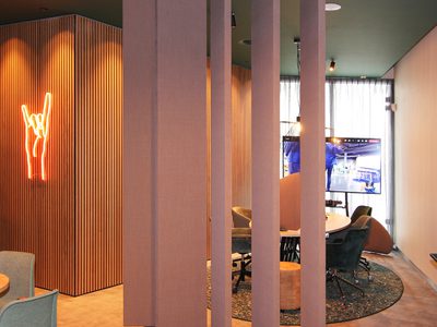 The ARTdivider is an acoustic partition wall with individually rotatable panels that can be turned open or closed as desired. This makes this sound-absorbing room divider ideal in rooms with many different places that occasionally need to be visually and acoustically shielded.