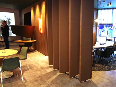 This rotatable acoustic room divider is available in almost any desired shape, colour and size and is assembled on location, so that it completely blends into your interior.