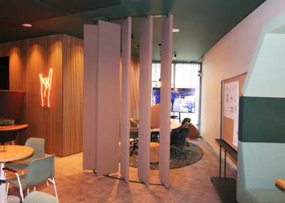 The acoustic partition wall has a dual function. Firstly, as a visual partition between spaces and, secondly, to actually improve acoustics.